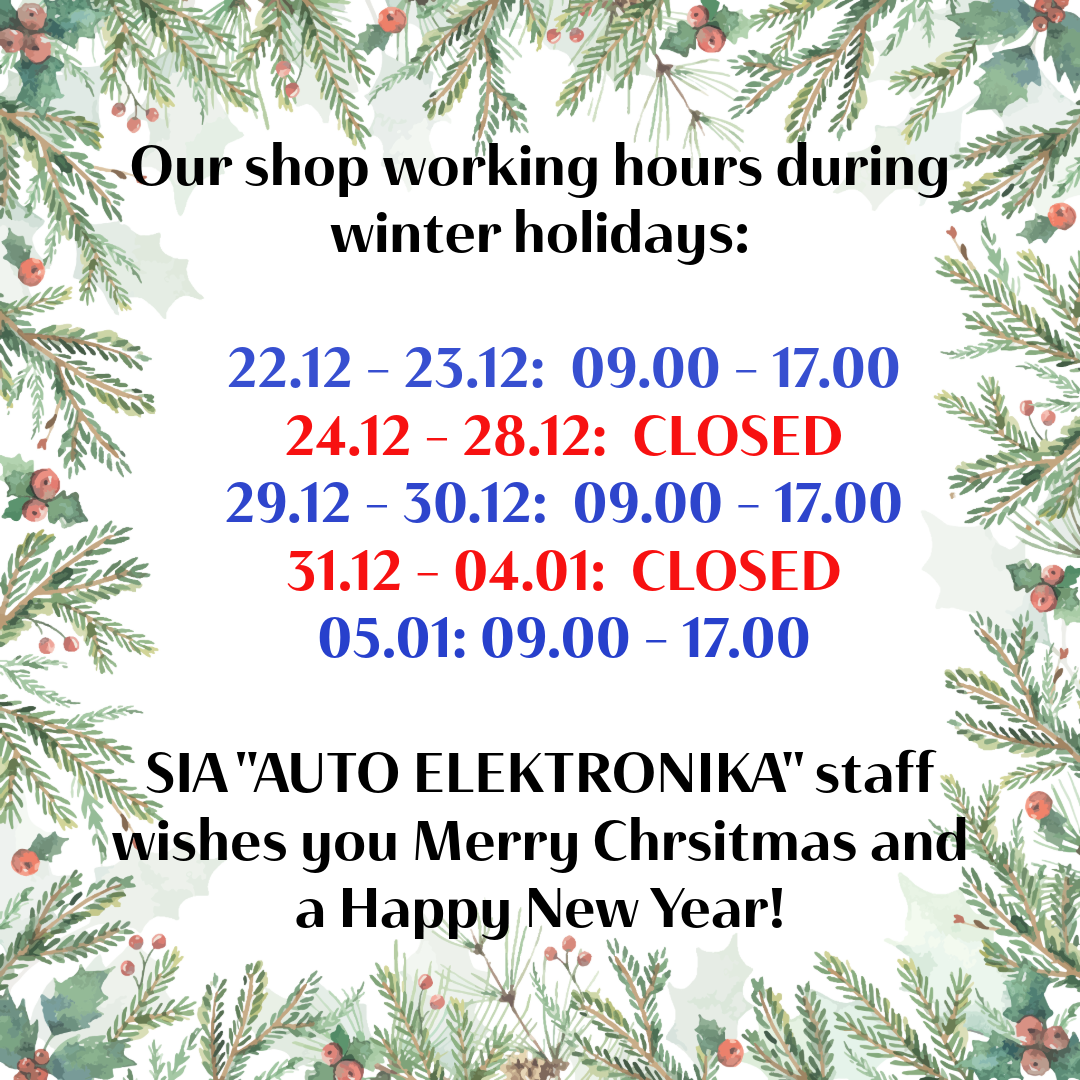 Our shop opening hours during winter holidays: 14.12: 09.00 – 17.00 21.12 - 26.12: CLOSED 27.12 - 28.12: 09.00 – 17.00 29.12 - 01.01: CLOSED 02.01: 10.00 - 17.00 SIA "AUTO ELEKTRONIKA" staff wishes you a Merry Christmas and a Happy New Year!